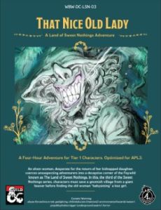 A 4-Hour adventure set in the Land of Sweet Nothings (the creator's Feywild domain); Legal for D&D Adventurers League Forgotten Realms characters levels 1-4. An elven woman¸ desperate for the return of her kidnapped daughter¸ coerces unsuspecting adventurers into a deceptive corner of the Feywild known as The Land of Sweet Nothings. In this¸ the third of the Sweet Nothings series¸ characters must save a gnomish village from a giant beaver before finding the old woman "babysitting” a lost girl.