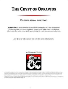 A wonderfully short adventure about constructs¸ cultists and crypts. The Crypt of Opravius is a 5th Edition adventure. The aim of this adventure is to serve as a way to introduce people new to Dungeons and Dragons 5th Edition. This is my first attempt at writing an adventure¸ any and all feedback would be greatly appreciated.