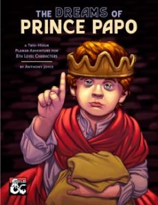 Winner of M.T. Black's Lonely Scroll Competition 2019 All proceeds go directly to Extra Life¸ a non-profit that supports local Children's Miracle Network Hospitals. "The Dreams of Prince Papo" is a Two-Hour Planar Adventure for 8th Level Characters. Content Warning: Child Loss I never intended or imagined I'd have written this adventure when I decided to compete in M.T. Black's Lonely Scroll Competition. The adventure that follows is one from the core of my heart¸ that came to me out of nowhere¸ and allowed me to grieve over an experience I never fully embraced. My wife¸ family¸ and I hope this adventure brings some joy¸ closure¸ and positive memories to those with similar experiences. The entire adventure is free. If you feel like donating to Extra Life you can do so¸ and for that¸ I thank you. I also include two versions of the one-page adventure in letter and A4 format. Thank you¸ and I hope you enjoy. - Anthony (@thrawn589 on Twitter)