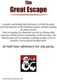This is a short adventure¸ during a short half hour. It is designed to be simply taken and played. All needed stats are included in the document¸ so no other sheets - be they the Monster Manual or character sheets - are needed. Only paper¸ pens¸ dice¸ and the game can begin! In this adventure¸ the party are prisoners of the evil Ochebana Empire. They escape the prison¸ all the while attempting to get the highest possible score. A prisonload of fun!