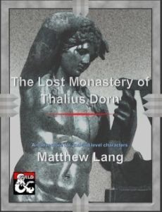 The Lost Monastery of Thalius Dorn is a Tier 1 adventure for characters of about levels 1-2 and tasks the players with sorting out a little disagreement between a group of devils and the clerics who'd like them out of their temple. It's intended as a branching narrative with a number of different options for tackling it's challenges and suited for a character driven table. Estimated playtime is about 8-12 hours¸ depending on just how long your players spend planning or talking to NPCs.