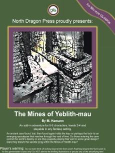 Beware the arrival of Yeblith-mau! An ancient cave found¸ lost¸ then found again holds the key--or perhaps the lock--to an emerging apocalypse that reaches through the void of time. Do those entering the cave control the world's destiny or are they puppets playing their part in some great design? Dare they disturb the secrets lying within the Mines of Yeblith-mau ? The Mines of Yeblith-mau is an add-in adventure for 6-8 characters¸ levels 2-4 and playable in just about any fantasy setting. The adventure is a classic dungeon design¸ with some twists¸ for use with basic/expert-styled OSRs and contains descriptions of a cavern complex¸ two dangerous new monsters¸ four intriguing non-players¸ and five wild new items for your fantasy setting! Previews contain all the important materials for the adventure! Please check it out so you can be confident about what you are getting! Note that green text in the preview indicate internal document links within the PDF copy. The text is black in the printed version. Please let us know what you think and contact us with any questions! Best wishes and good gaming!