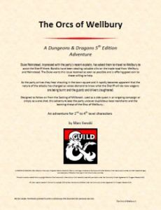 The Orcs of Wellbury Duke Holmstead¸ impressed with the party's recent exploits¸ has asked them to travel to Wellbury to assist the Sheriff there. Bandits have been stealing valuable silks on the trade road from Wellbury and Holmstead. The Duke wants this issue resolved as soon as possible and is offering good coin to those willing to help. As the party arrives they hear shouting in the town square and it rapidly becomes apparent that the nature of the attacks has changed as voices demand to know what the Sheriff will do now wagons are being burnt and the guards and drivers slaughtered. An adventure for 2 nd to 4 th level characters Designed to follow on from the Sacking of Millbrook¸ used as a side quest in an ongoing campaign or simply as a one shot¸ this adventure sees the party uncover duplicitous local merchants and the looming threat of the Orcs of Wellbury…