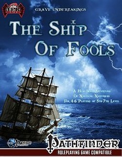 Welcome to the weather-beaten deck of the Green Lady¸ a galleon adrift on the blue-green waves... but where is her crew? Where is her legendary captain¸ the self-exiled wizard¸ Vossian the Green? Set sail 'lubbers and find out in this¸ our very latest Grave Undertaking starring your characters as the daring scallywags destined to solve the mystery of The Ship of Fools. You're sure to enjoy this excellently weird horror-trip written especially for the Pathfinder Roleplaying Game¸ and delivered in true TPK Games fashion. Brave deadly zombies¸ mind-control slimes¸ suicidal haunts¸ sharks¸ swarms of eels and maybe your own crew (!) amongst other delightful deadlies in this rollicking good time!