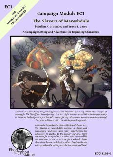 An introductory adventure for 4-6 first level characters¸ The Slavers of Mareshdale provides a village and surrounding wilderness with many opportunities for adventure. In addition to the primary storyline¸ there are seeds for many other scenarios¸ and an area GMs can continue to use as a base for low-level player characters. Future modules from Ebon Gryphon Games will expand on the setting and plotline introduced here!