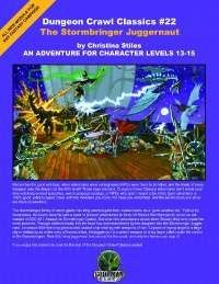 The Stormbringer family of storm giants has long extorted gold from coastal towns as a "good weather tax." Fed up by rising taxes¸ the towns recently sent a band of stalwart adventurers to finish off Stozari Stormbringer for good (as witnessed in DCC #21: Assault on Stormbringer Castle ). But when the adventurers struck down Stozari¸ they only made her more powerful. Through eldritch rituals¸ her life force has been transferred by her daughter into the Stormbringer juggernaut¸ a massive 800-foot-long giant-scaled assault ship bristling with weapons of war. Capable of laying siege to a large city or defeating an entire navy of human ships¸ the juggernaut is a potent weapon to bring larger cities under the control of the Stormbringers. Now this living juggernaut has set sail for the coast¸ and only the heroes can stop it!