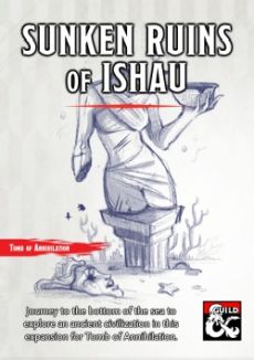 Free entertainment during pandemic times. In light of current events¸ I have decided to offer this adventure for free. It's a small gesture but I hope it can help a little bit. The Sunken Ruins of Ishau Near the jungles of Chult¸ beneath the waves of Refuge Bay¸ lies a ruined city. Evil hags and their minions make their home among the ancient relics. Even deeper down¸ at the bottom of an old undersea lake¸ an otherworldly monstrosity guards its eclectic hoard of oddities. What does it know about the Soulmonger? An adventure for characters between levels 4-6 Requires the Tomb of Annihilation adventure This 44 page adventure adds Ishau as a location to your Tomb of Annihilation campaign. It describes the city's history and current inhabitants¸ including maps¸ new monsters¸ and treasure. In an undersea temple¸ characters face off against a coven of sea hags. The sunken wreck of the Decapus is the lair of sea spawn pirates. And among the ruins lurk giant crabs¸ skeletal sharks¸ vegetan mummies¸ and other monstrosities. A second location¸ complete with keyed maps¸ is available to characters who wish to dig deeper: the underwater island-domain of a Morkoth¸ pulled into Chult by Acererak's magic. The Morkoth's home is in disarray. Trophies it collected from across the multiverse are now running wild and its treasures are being looted by marauders from Ishau. If the characters help¸ it may share its secrets with them.