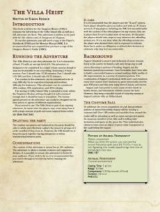 The Villa Heist is a self-contained adventure that will see the party infiltrating a costume party at the island getaway of a renowned alchemist. The goal: find the alchemist's vault and clean it out. Plan¸ execute¸ and escape from the most daring heist ever attempted. My pitch to Players: Do you want to play a heist adventure? Of course you do. What's that? You're not a rogue? Well this heist is more than sneaking in through windows and knocking out guards! You'll have to infiltrate the villa under false pretenses and pass yourself off as a party guest... You don't like talking to people? Well what do you like? Hitting things huh¸ well there's plenty of that too. If I wrote this right (and I did) there's at least a little something for every kind of player. Just give it a chance¸ you'll see. My pitch to DMs: You know how running an adventure takes a lot of work? You have to draw maps¸ roll up NPCs¸ look up stats¸ and consider the creative ways in which your players are going to break everything. Well I've done all that for you. I've even condensed all of the possible skill rolls a character can pass in each section into nifty little tables so you don't have to go digging through the text. If you've got a player's handbook¸ a monster manual¸ and 15 minutes to read this cover to cover you're ready to run it. This adventure is designed for 4 to 6 characters of level 3-5 with an average level of 4. The adventure is designed to be completed in a single 4-hour session though it may not be possible to see everything. The combat in this adventure can be considered to be of easy difficulty for an experienced group and medium difficulty for beginners What this adventure includes: An original Dungeons & Dragons adventure written for the 5th edition Player and DM versions of the map Suggestions for adapting the adventure to different audiences and player groups as well as suggestions for adapting it into an existing adventure Page references to the PHB¸ MM¸ and DMG for every monster¸ mechanic¸ and magic item not explicitly described in the adventure Notes on how to roleplay various NPCs 5 side quests with recommendations for Forgotten Realms faction tie ins.