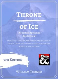Venture into the brutal cold north and discover the secrets that lie on the floating island of Norgasheim! Welcome to Throne of Ice a 7-10 hour adventure designed for players from levels 4-7. Fight legendary enemies¸ mingle with secretive villagers¸ delve into forgotten libraries¸ and discover a treasure that has been lost for centuries. Here's what is included in this adventure: An amazing adventure wrapped up in political intrigue and betrayal 5 Awesome maps A mystery to be solved in a destroyed castle Fierce encounters that will have you on the edge of your seat A dark twist that your party will never see coming! I hope you enjoy this adventure as much as I did!