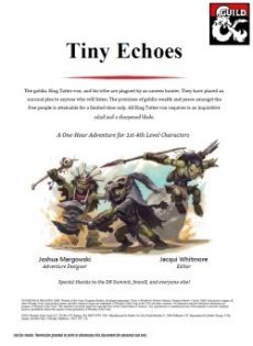 The goblin¸ King Tatter-roo¸ and his tribe are plagued by an unseen hunter. They have placed an unusual plea to anyone who will listen. The promises of goblin wealth and peace amongst the free people is attainable for a limited time only. All King Tatter-roo requires is an inquisitive mind and a sharpened blade.