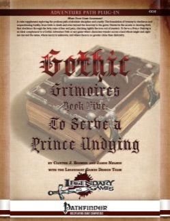 The fifth in our line of Gothic Grimoires¸ To Serve a Prince Undying probes the cold and bitter heart of cultures and traditions devoted to despotism¸ where monarchy becomes absolute autocracy and might is pure and righteous tool of tyranny. To Serve a Prince Undying is an ideal complement to a Gothic Adventure Path or any game where characters must face up to a society in which absolute and unquestioning obedience is a matter of life and death... or worse¸ as death itself may be no escape. Handed down through countless generations of slave-scribes¸ this benighted book includes 4 new inquisitor judgments¸ including pursuit and murder; new Vows of Obedience and Self-Sacrifice; access to a variety of spells of torment for inquisitors and ki-powered characters¸ including new spells extravasation of tears¸ revenancer's rage¸ and ruthless beating; and a host of rules for characters of many kinds to learn the ways of pain¸ including Lawful Evil antipaladins.