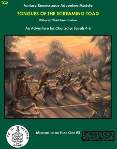 TG2 Tongues of the Screaming Toad is the second adventure in the Fantasy Renaissance Adventure Module series MEMORIES OF THE TOAD GOD. It is designed for a party of four to six characters¸ levels 4 to 6. The GM should read the module thoroughly before playing to become familiar with the overall plot of the adventure.