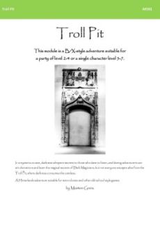 Troll Pit takes the adventurers to a small dungeon¸ which tempts them with powerful prophecies and wizards with new powers. It as an adventure suitable for B/X games and retro-clones such as Labyrinth Lords and Old-School Essentials.