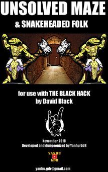 The Unsolved Maze is a module for GM created for use with The Black Hack (you must have the latest version to play this adventure). The maze is detailed by maps¸ littered with traps and inhabited by new monsters¸ so you can organize a good hunt in an underground environment. You can choose how to play the adventure (a rush towards the goal or a more in-depth exploration) and it's easy to adjust the difficulty to your party level. So you are ready to meet the Snakeheaded folk and try to discover what are they doing in their new labyrintic lair.