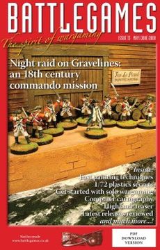 The PDF version is identical to the original printed version other than minor alterations to update subscription information and indicate the new format. The file is 144dpi¸ sufficient to enable you to 'zoom in' on pictures and achieve a pleasing print-out at home. Bags of potential. New contributor Diane Sutherland brings a female perspective on the hobby. This long-suffering 'wargames widow' discusses the way we accumulate mountains of "Stuff' that most sane people would probably throw away. Mike Siggins' Forward Observer column can't avoid dealing with the arrival of yet more 28mm plastics¸ but also looks at bases¸ the new Kiss¸ Kiss¸ Bang¸ Bang pulp range¸ washes and painting techniques¸ adhesives¸ Sharp Practice from the Lardies¸ Alban Miniatures and much more besides. Bob Barnetson¸ one of our most prolific contributors¸ shows the breadth of his talents with The least you can do ¸ a quick-and-dirty lesson in getting your wargames armies painted and ready for the table fast! Stokes Schwartz is new to Battlegames ¸ but well-known to Old Schoolers who enjoy exploring imagi-nations. In 12 must-know secrets about 1/72 plastics ¸ he extols the virtues of those much-maligned boxes of miniatures that can be found in almost every toy and model shop. Solo wargaming: the joy of self-simulation is Rich Barbuto's contribution to this packed issue. Rich is Editor of Lone Warrior ¸ the journal of the Solo Wargamers Association¸ and has many excellent ideas for inspiring us to explore the potential of challenging ourselves in our wargames. Now that I'm taking a break from the Wars of the Faltenian Succession¸ I thought I'd come up with a tough¸ teaser-type challenge for you. The result is Night raid on Gravelines ¸ best described as an 18th-century commando mission! Can your brave Marines execute the perfect sneak attack on this well-defended pirate lair? C S Grant's Table Top Teaser is Fighting withdrawal¸ or over the hills and far away ¸ which has you pitching regular¸ government troops against onrushing hordes of highlanders charging through the heather. Can you make it back to the fort? In To Boldly Go ¸ our fantasy & sci-fi Editor Roger Smith recalls the delights of his trip to Salute earlier this year and the surprising range of inspiration he derived from it. Roger tempted by Napoleonics? Surely not! Yet another new writer gets into print this issue: Tyler Provick explains Computer cartography for wargamers ¸ giving us a useful introductory lesson on how to use free software like Inkscape to create magnificent maps. Unlike last time¸ the Recce section is absolutely heaving with reviews. Having held over stuff I didn't have space for last time¸ there was plenty to catch up with anyway¸ but a lot more bits and pieces have arrived over the last several weeks! A host of books¸ figures¸ models¸ computer games and rules come under the famously impartial Battlegames scrutiny. With his usual wit¸ John Preece's short War and Preece column honours the Oxford University Wargames Club¸ which may indeed be the oldest wargaming society in the world. This PDF version is priced at 50% of the original printed version¸ making it affordable for gamers everywhere.