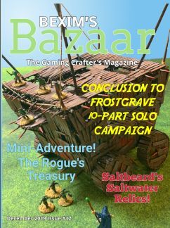 Bexim's Bazaar is a monthly gaming magazine dedicated to RPGs and wargames… and occasionally a boardgame of interest to RPG/wargamers. GMs and players will find plenty of resources such as magic item cards¸ random tables¸ mini-adventures¸ and articles related to gaming as well as printable props to hand out in game. This issue contains over 80 pages of gaming content for a variety of genres and games¸ and gamers are welcome to submit their own content for future issues (info on submitting is found inside each issue).