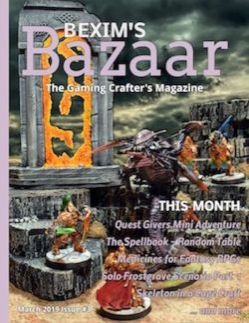Bexim's Bazaar is a monthly magazine dedicated to RPGs and wargames with a focus on gaming crafting. A new issue will be released on the 1st of each month. Each month¸ original articles on gaming and crafting will appear along with the following regular columns: