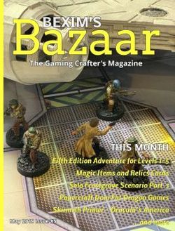 Bexim's Bazaar is a monthly magazine dedicated to RPGs and wargames with a focus on gaming crafting. A new issue will be released on the 1st of each month. Here is this month's Table of Contents: