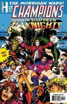 THE MORRIGAN WARS begin anew! For the first time in color¸ it's Part Two of the classic crossover between the LEAGUE OF CHAMPIONS and the SOUTHERN KNIGHTS. This is a book-length¸ 26-page adventure¸ with story by Henry Vogel and Dennis Mallonee¸ artwork by Lou Manna and Mark Propst¸ and a cover by the legendary George Perez. All this¸ plus two Flare Sunday pages by Dennis Mallonee and Sean Harrington. Cover by George Perez
