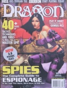 Up on a Soapbox - The Spell Gone Awry (Robert J. Kuntz); Playing the spy game; Covert Ops; New gear - alchemical¸ magical¸ and mundane; Divinations in D&D; Stealth for non-rogues; Black Dwarf Mine; New feats and an introduction to psionic focus; Mushroom Archery; Character Intelligence vs Player Intelligence.