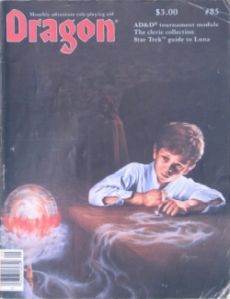 Dragon Magazine¸ Issue 85 TSR (Tactical Studies Rules) Universell Magazine 🔗 Magazin Heft 96 Seiten EnglischEnglish 1984 Unterstütze Deinen lokalen Spieleladen vor Ort!Support your local dealer 🔗 DescriptionDescription Twofold Talisman (AD&D module); Cleric Collection (3 articles); Ecology of the Ixitxachitl; Stone's Throw Away (Dragonlance fiction).