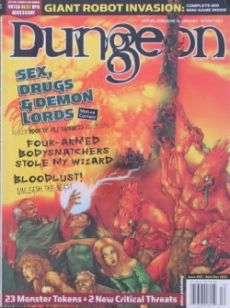 (Nov/Dec 2002) The Jackal's Redemption (D&D RPG lvl 9). The Witch of Serpent's Bridge. Critical Threats: Yu'thiol Mansecho (githyanki). Critical Threats: Keershaz the Imp. Porphyry House of Horrors - An adventure featuring mature content in support of the new Book of Vile Darkness. It is presented in a special sealed section.