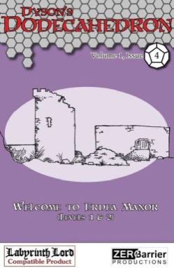 Issue 4 of Dyson's Dodecahedron is the first half of the Erdea Manor adventure module. Covering the surface and upper two levels of Erdea Manor¸ this adventure brings the characters into conflict with the current raiders of the manor and possibly the recently evicted dwarves who were there before.
