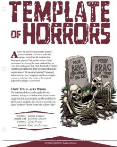 These 4 horrific templates can be applied to any creature! Use the zombie¸ wight¸ skeleton¸ and banshee templates to create horrors such as a wailing hermit (a banshee ettin)¸ rust monster skeleton¸ crypt stalker (a minotaur wight)¸ or basilisk zombie -all creatures included in the PDF !
