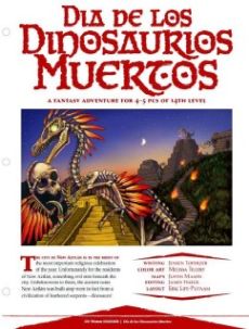 You've heard of the Day of the Dead... but what happens when the dead are dinosaurs? When the raptors awaken to find their land overrun by hairless apes¸ they plot to reclaim their legacy. Can the PCs survive the machinations of Miquiztlicoatl¸ the velociraptor mummy lord¸ ancient reptilian priest-king of the feathered throne?