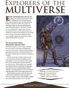 Meet the Planar Explorer and the Way of Infinite Worlds¸ two brand new archetypes for adventurers who seek to cross the boundaries between dimensions. Whether your preferred destination is the Inner or Outer Planes¸ a lesser-known demiplane¸ or somewhere even more unusual these character options are perfect for those who want just little more than the Prime Material can offer.