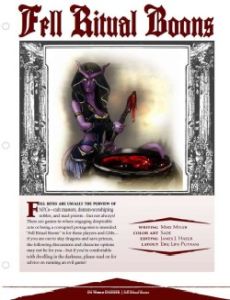 This issue of EN5ider embraces the dark side with character options for evil characters. These 4 Ritual Feats (Ancestral Sacrifice¸ Auromancy¸ Master of Rituals¸ and Ritualistic Slaughterer) are accompanied by advice on running an evil game.