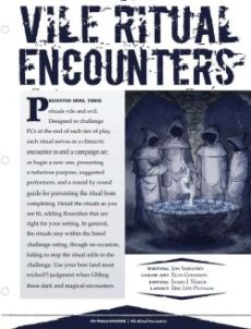 The three encounters in this issue of EN5ider (The Summoning at CR 5¸ The Poisoning at CR 10¸ and The Immolation at CR 15) are designed to challenge adventurers with climactic rituals described round-by-round.