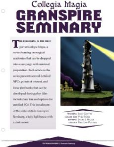 This holy lighthouse holds a dark secret. The start of a series on plug-in magical colleges¸ this article of EN5ider contains rumors¸ plot hooks¸ background options¸ a new item¸ a new spell¸ and the Sea Monk¸ the nameless demon of Granspire Seminary.