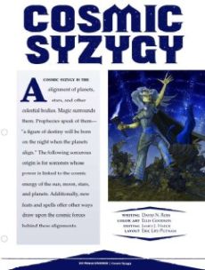 Some sorcerers are linked to the heavens - the cosmic power of stars¸ moons¸ and planets. This new sorcerous origin is accompanied by the Astrologer and Cosmic Ritualist feats¸ and the new spells astromancy and eclipse. Sorcerers with the Cosmic Syzygy ring grow more powerful at times of astrological significance¸ and are able to evoke the power of destiny¸ draw energy from the alignments of celestial bodies¸ and glimpse into the future.