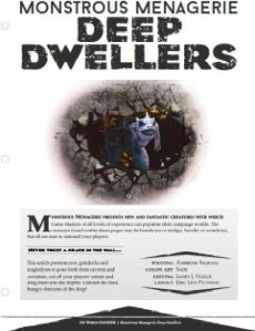 EN5ider 149: Monstrous Menagerie: Deep Dwellers (5e) Fantasy 🔗 EN Publishing Ambrose Ingram Sade Universell Magazine 🔗 Magazin PDF¸ Original electronic EnglischEnglish 2019 Als PDF erhältlich bei DrivethruRPGAvailable as PDF at DrivethruRPG Unterstütze Deinen lokalen Spieleladen vor Ort!Support your local dealer 🔗 DescriptionDescription In this issue of EN5ider you can find 5 unique monsters from deep underground: the Grimlock Supplicant¸ Grimlock Brute¸ Revilok¸ Troglodyte Meatseeker¸ and the Troglodyte Wallower.