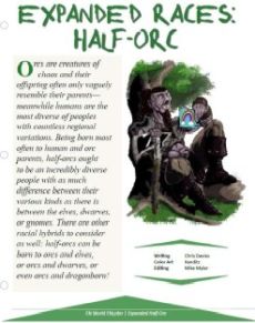 EN5ider 236: Expanded Races: Half-Orc (5e) Fantasy 🔗 EN Publishing Chris Davies Xanditz Universell Magazine 🔗 Magazin PDF¸ Original electronic EnglischEnglish 2019 Als PDF erhältlich bei DrivethruRPGAvailable as PDF at DrivethruRPG Unterstütze Deinen lokalen Spieleladen vor Ort!Support your local dealer 🔗 DescriptionDescription This selection of half-orc subraces includes the barbaric Bloodrager¸ fiendish Brimskin¸ deadly Deeplurker¸ industrious Forgemaker¸ draconic Scalefang¸ and the primal Spiritspeaker.