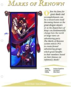 This article addresses an oft-overlooked aspect of the typical campaign: how an adventuring group's reputation can have a nuanced impact on them and the world at large. The Marks of Renown optional rules introduce several different kinds of marks-Evil¸ Honor¸ Ingenuity¸ Magic¸ Nature¸ Power¸ Righteousness¸ and Skullduggery-that every member of the party can use¸ each with their own benefits and drawbacks to make for an intriguing new element ripe for inclusion at any game table! By Andrew Engelbrite; illustrated by Indi Martin.