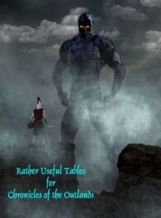 Rather Useful Tables for Chronicles of the Outlands This is a wholly new¸ sort of¸ set of tables that are not required but do come in handy when running Chronicles of the Outlands. As with everything in free-style role-play¸ use what you find useful. I use these in my own campaign quite often. The booklet includes the Digression tables alluded to in the other rulesets¸ a handy thing with which to threaten your players. It also has two more encounter settings to use inside your adventures Included herein are twenty new Quick and Dirty tables to add event driven action to resolve the following situations of mission inconsequence encounters: Traversing the Frontier Q&D Cautious Discourse Q&D Challenging Willful Ignorance Q&D Foraging Q&D Groundwork for Battle (Avoid Hazards) Q&D Backtrack (w/o Loss) Q&D Recognizing Set-Back (No Overreaction) Q&D Windfall or Agony (against Spectres) Q&D Raising the Mood (to welcoming) Q&D No Stone Unturned (Scouring the Land) Q&D Finding Purpose (Renewing Hope) City-State Stopover Q&D Grovel with Dignity Q&D Due Diligence and Drudgery Q&D Surviving the Hangover Q&D Serve using Reason and Flattery Q&D Peaceful Disentanglement Q&D Appeal to the Masses Q&D Scout¸ Hunt and Trail Q&D Games and Sport Q&D When Speed is of the Essence Q&D Bonding and Fitness This may be the last of the source materials for Outlands for a few years¸ or forever should I keel over and die. I am moving on to another favorite genre¸ Sci-Fi. As I promised long and long again for Cutlass¸ a campaign booklet for Outlands is being written. Yet the release date depends much on George RR Martin's timely completion…kidding. Cut me some slack¸ I'm old - started in this racket¸ circa 1975¸ with the mimeograph magazine¸ the Reinforcements. Find a copy of that; I dares yeah.