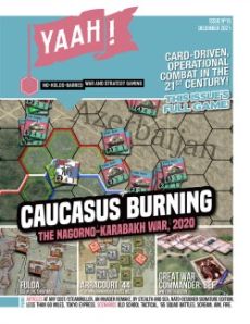 Here's what's jammed into the magazine's 90+ pages... First we have the clever¸ card-driven¸ hex and counter executed game. Titled¸ Caucasus Burning: The Nagorno-Karabahk War¸ 2020 ¸ the simulation is an operational design by Greg Porter covering the Nagorno-Karabahk War of 2020. You'll command formations of T-90 tanks¸ BMP-equipped mechanized infantry¸ drones¸ cruise missiles¸ and squadrons of attack aircraft as you simulate the war between Armenia and Azerbaijan¸ which took place in the fall of 2020. Units represent battalions grouped into brigades. Maneuver and attacks in the game are done via actions played from a deck of cards¸ and each pass through the deck represents 2 days and nights of fighting. A game of Caucasus Burning: The Nagorno-Karabahk War¸ 2020 will probably take a little less than 10 passes through the deck¸ so it will run a little faster than the actual war.