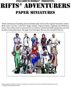 Rifts Adventurers! Including male and female paper minis for the original Adventurer classes: Body Fixer¸ City Rat¸ Cyber-Doc¸ Rogue Scholar¸ Rogue Scientist¸ Vagabond and Wilderness Scout. These 28mm minis are presented in two formats¸ outlined and blank background¸ and each includes a tech pattern base. One page of tri-fold figure flats are also included in this set.