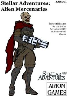 Throughout the Galaxy there are numerous Alien races; some peaceful and some warlike. The fate of the latter is often to end up as Mercenaries¸ fighting for whoever has the biggest credstick! This set of paper miniatures for the Stellar Adventures RPG (or indeed any SciFi game) provides five each of three different Alien Mercenary races. Also included is a brand new seven page supplement for the Stellar Adventures RPG detailing the Blazing Comet Mercenary company. This supplement contains details of the Company itself¸ new weapons and three new playable Alien races. The full colour miniatures (now with illustrated backs!) are supplied in pdf and Powerpoint format to allow the easy creation of custom sheets and can be assembled as flat or A-frame miniatures depending on personal choice. In this set: 5x Amul Mercenaries 5x Kanus Mercenaries 5x Omrig Mercenaries 3 page pdf (2 pages of figures)