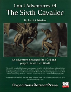 1 on 1 Adventures 04: The Sixth Cavalier Expeditious Retreat Press Patrick Weekes Universell Solospielbuch 🔗 Abenteuer Softcover 32 Seiten EnglischEnglish 2006 Unterstütze Deinen lokalen Spieleladen vor Ort!Support your local dealer 🔗