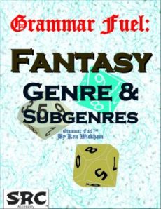 Grammar Fuel: Fantasy Genre & Subgenres is a 107-page book of random noun¸ verb¸ adjective¸ and adverb d100 tables each for the Fantasy genre: fantasy¸ dark fantasy¸ sword and sorcery¸ fantasy war¸ mythology¸ myths and fables¸ sword & sandal¸ epic & high fantasy¸ grimdark¸ witch¸ magic¸ demon¸ goblin¸ orc¸ troll¸ dragon¸ elf¸ dwarf¸ and fairy . It is useful to help inspire the creation of fictional stories and games based on random keywords.