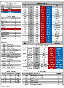 Tired of flipping around in the book to find out how much damage a character takes when falling? Need to know the Material Value of the brick wall that character is about to smash through? Look no further! The 4C Expanded GM Screen has everything you need all in one convenient spot! This 3 page¸ no frills GM screen will help you keep the action flowing during those intense battles¸ when stopping to find the right table would totally derail the whole thing. Print it out on some heavy card stock and grab some Scotch Tape and you're good to go!