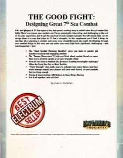 GMs and players of 7th Sea expect a fun¸ fast-paced¸ exciting story to unfold when they sit around the table. There's no reason your combats can't be as meaningful¸ interesting¸ and challenging as the rest of the play experience¸ but to get the most out of each combat encounter the GM should take care to design them in a way that plays to 7th Sea's strengths. In this supplement you'll find 6 steps to consider when planning a combat¸ and some (very straightforward) dice math. By thinking through your combat design in this way¸ you can make sure every fight feels significant¸ challenging - and most important - fun!