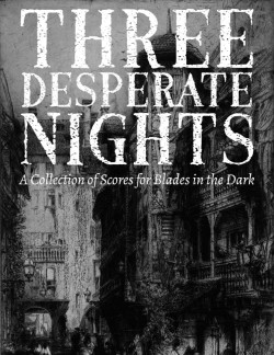 Three Desperate Nights is three potential scores or interesting events happening in and around Doskvol designed for the Blades in the Dark role-playing game. Use these to supplement the story of your game as it's happening¸ or kick start a new story when things are getting complacent or dull¸ or if you're just starting a new campaign. Treat them as individual events¸ or strong them together has related incidents with a sinister new plot.