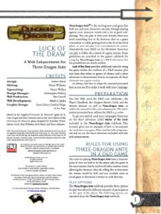 Three-Dragon AnteTM is the exciting new card game that both you and your characters can play (though playing against your character would take a lot of good roleplaying). You can play it with your friends when you need something fun to do between slots at a game convention or while getting food at the local fast-food place¸ or you can play it as a tournament for prizes. Alternatively¸ your D&D (or d20 MODERN) characters can play it within the context of a game session. Some guidelines are provided in the game's rulebook for using the Three-Dragon Ante in a D&D adventure¸ but the possibilities are nearly endless. Luck of the Draw provides additional rules for using the game within the confines of a D&D session¸ plus new feats that relate to games of chance and a short adventure to demonstrate how