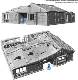 Constructed in the mid to late 2070s¸ Sanctuary Hills was a small suburb of the larger town of Concord¸ which was built on a small island reached by a wooden footbridge and made up of some 14 prefabricated homes. In the aftermath of the Great War¸ the conurbation was abandoned and became neglected with many of the homes collapsing due to the ravages of time and becoming nests for pests like radroaches and bloatflies. This surviving example is typical of the dilapidated houses in Sanctuary Hills and comes with detailed interior dressing and the option to 3D print its removable roof.