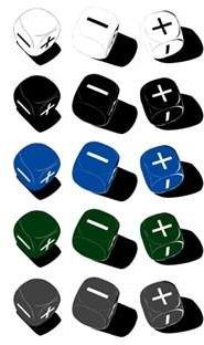 his stock art set by Elizabeth Porter includes variations of all three possible Fate™ Dice results in black¸ white¸ blue¸ green¸ and grey.