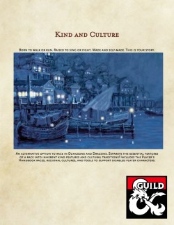 Instead of race covering physiology¸ culture¸ upbringing¸ and history¸ take a chance to break down the Player's Handbook races into one's born Kind and the traits that come with it and one's Culture¸ the regional and personal nature of your early life. Unlike the excellent Ancestry and Culture¸ this breaks down culture a bit more to allow for mixed communities with shared bonds. A forest human and a forest elf should have plenty in common¸ after all.